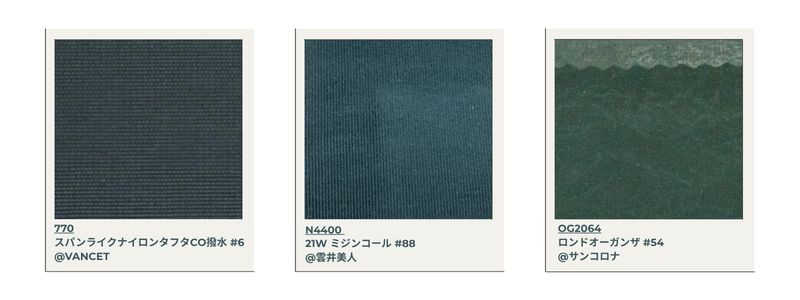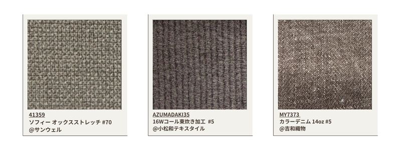 據說材料在日本生產難度很大,因為它常用於製作輕質丹寧布。透過精確控制染料濃度,可以實現三種不同的顏色效果。