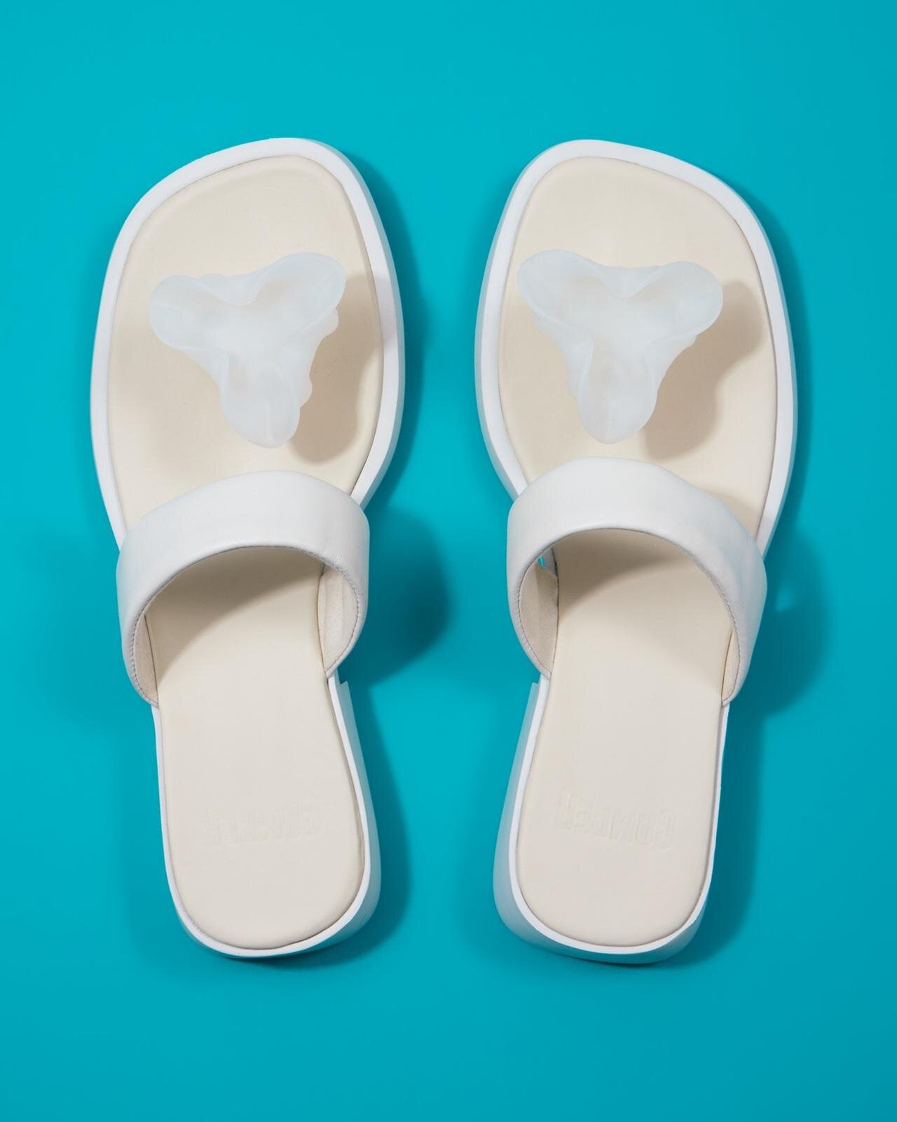 一款鬱金香造型的手提包,搭配鞋帶圖案元素飾有花朵圖案的涼鞋。這種將立體元素融入包包和鞋子設計的做法獨樹一格。