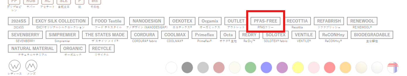 為了方便搜尋“不含PFAS 的布料”,我們創建並展示了一個名為“不含PFAS”的系列標籤。